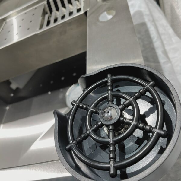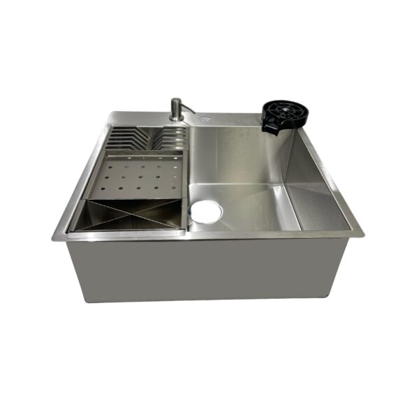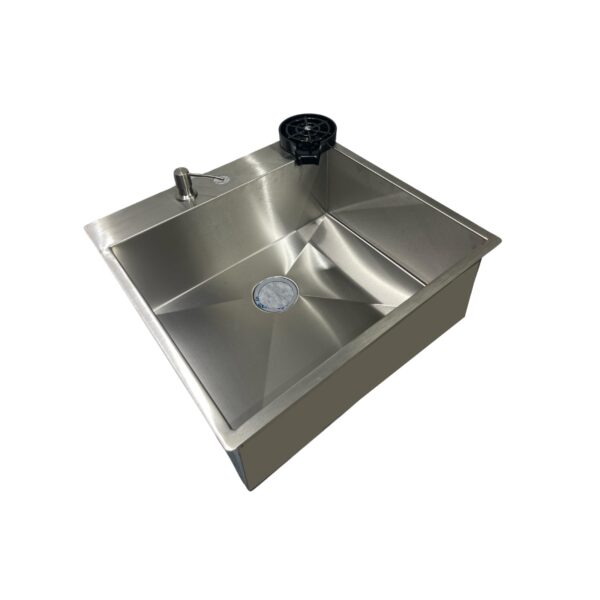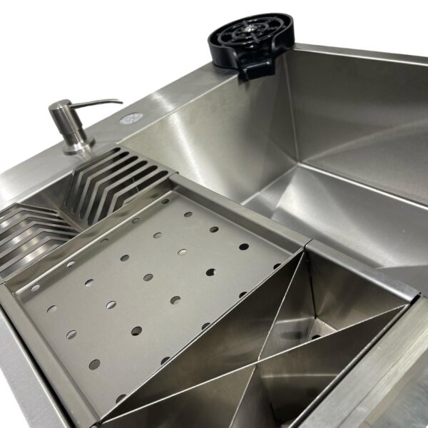 A cuba LUX já possui as furações para o dispenser, lava copos e torneira