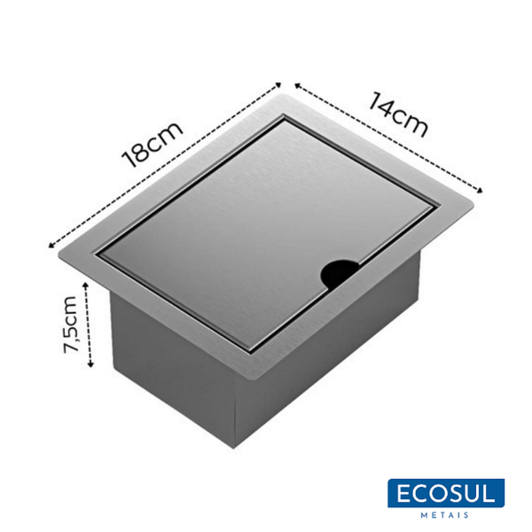 As dimensões externas são 18 cm x 14 cm x 7,5 cm, enquanto o recorte necessário para instalação é de 16 cm x 12 cm x 8 cm.